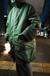 スコープ状のフードと見頃、袖のシルエットがミリタリーウェアをインスパイアしたデザインになります。