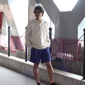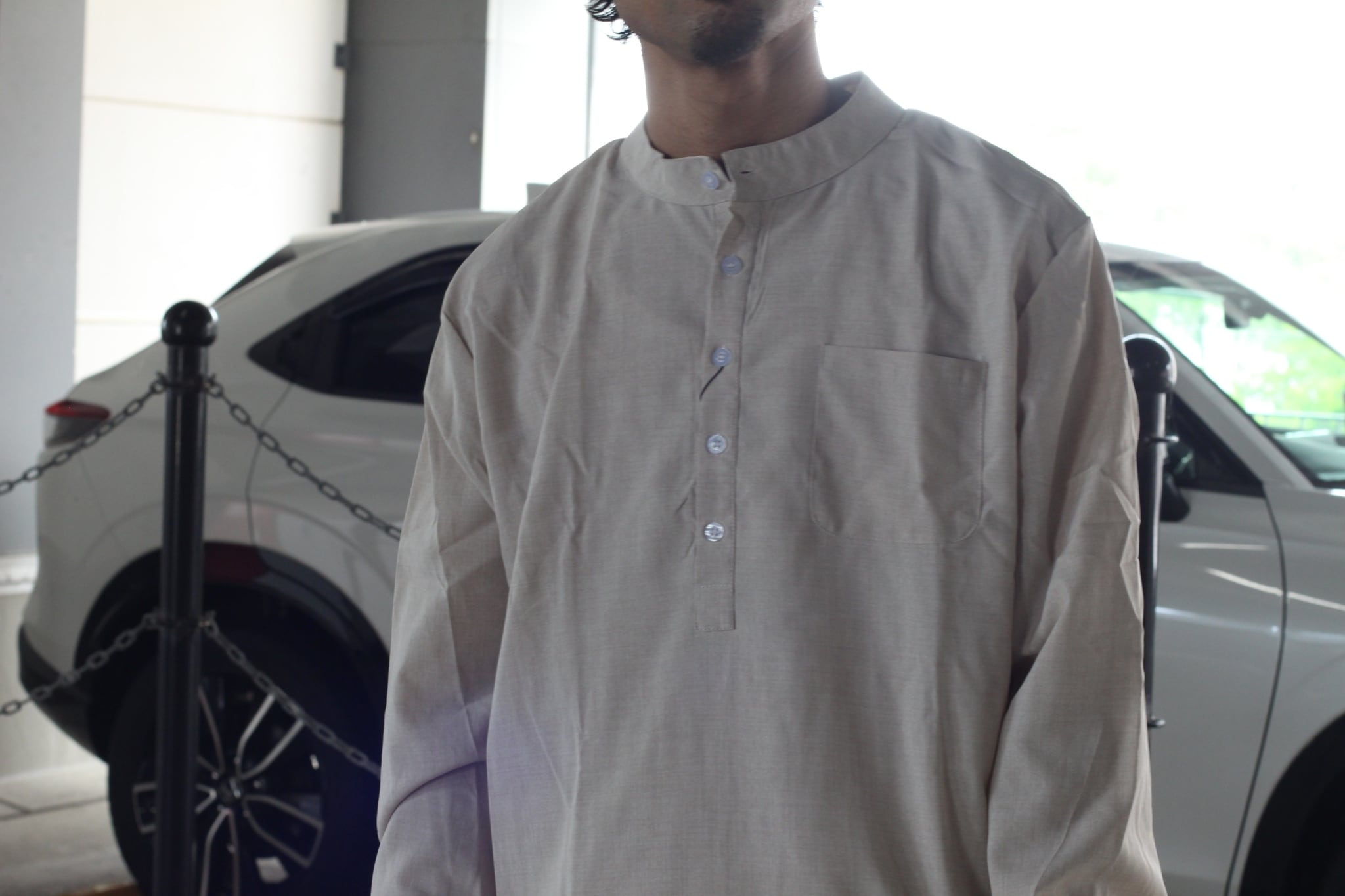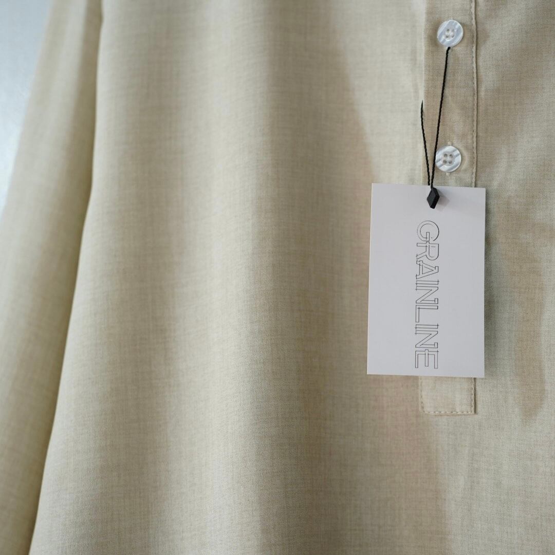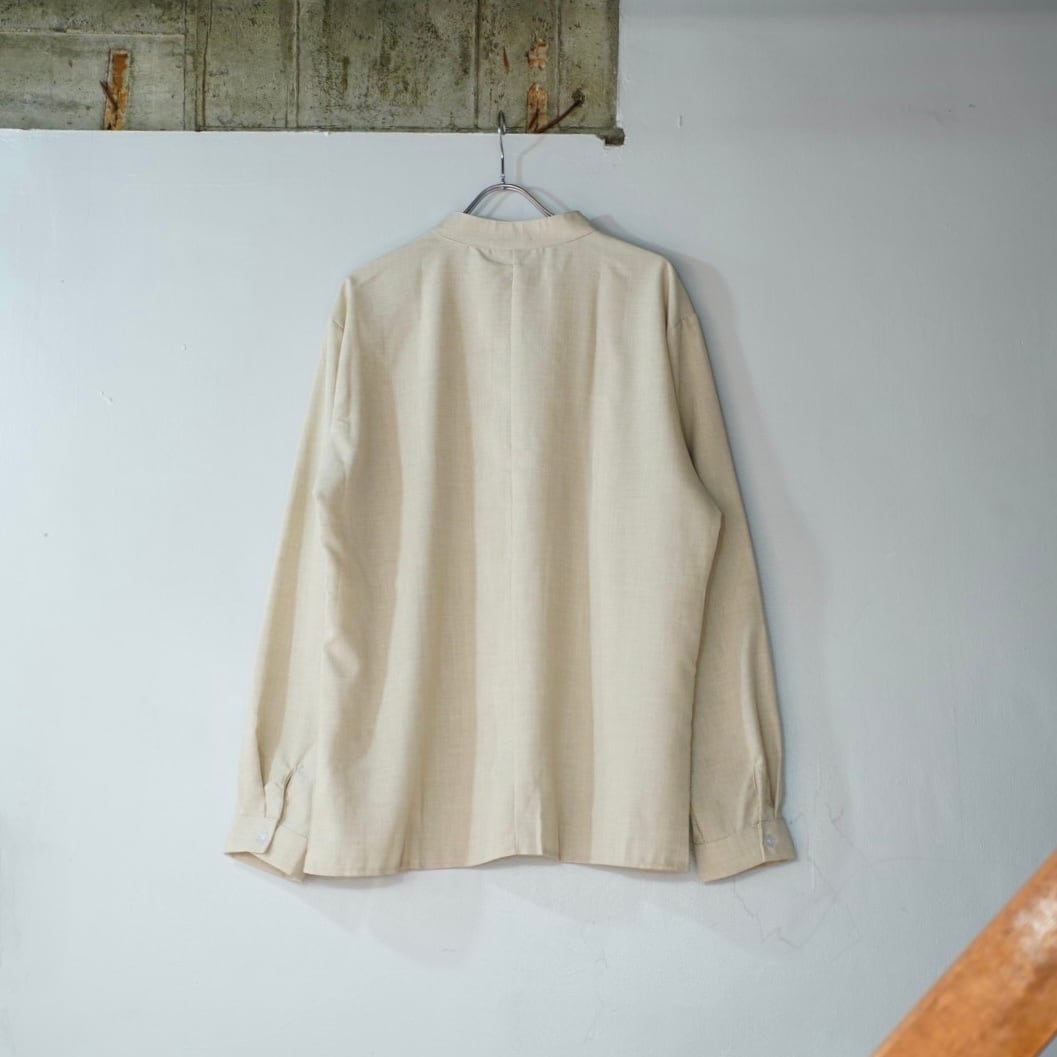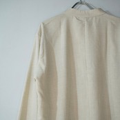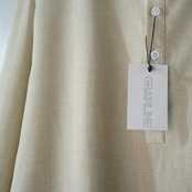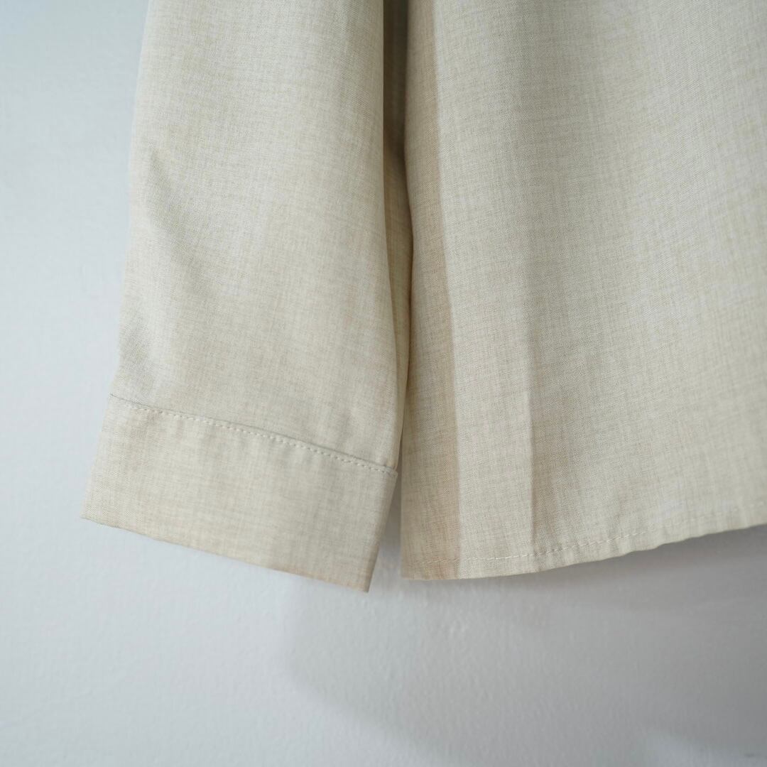 麻の様な素材感ですが素材はポリエステルで見た目よりもハリがあるシンプルなノーカラーシャツです。