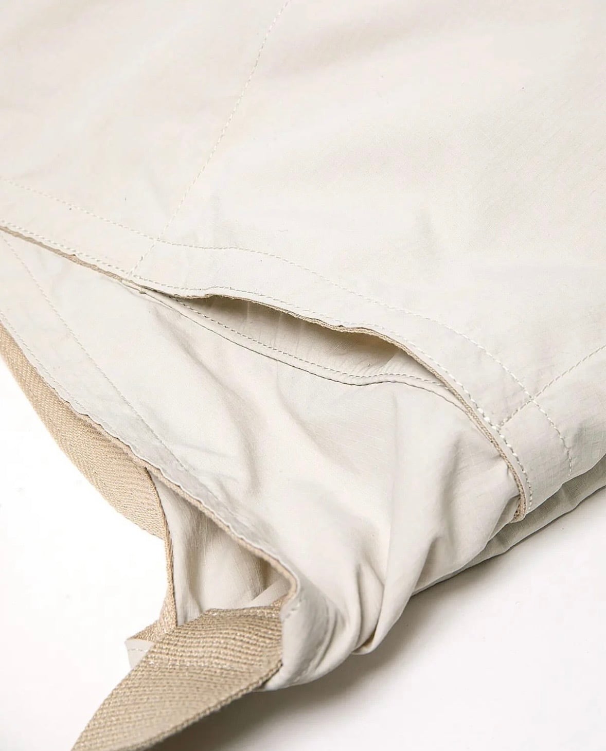 ふっくらと仕上がるタスラン糸によりコットンに似た肌ざわりとソフトな風合いを持ち、尚且つ撥水性にも優れた素材となっています。中肉のリップストップ組織はリサイクル素材といえど、ナイロン特有の強度も併せ持っています。