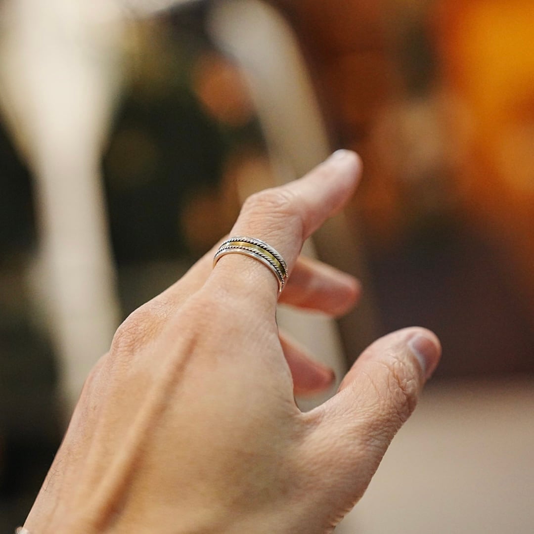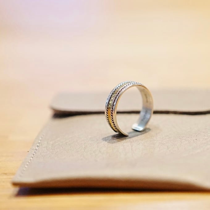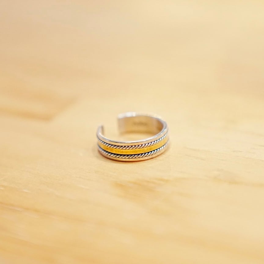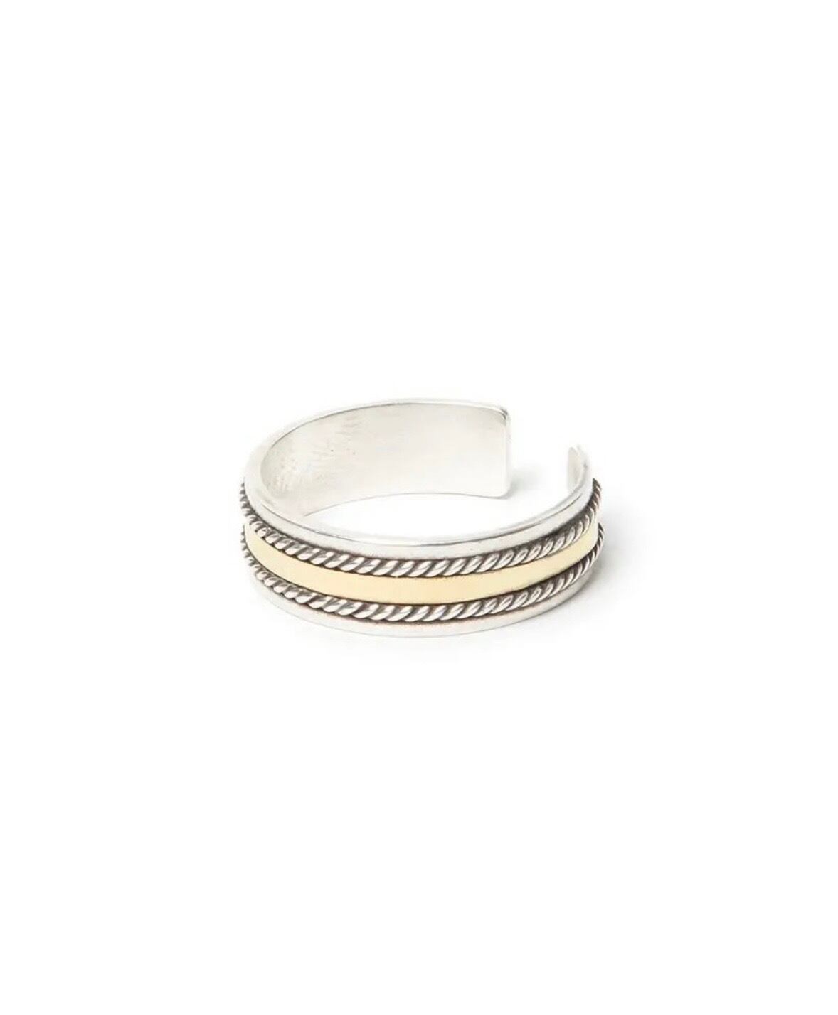 細やかなロープ状のシルバーでブラス製のプレートを挟んだ、異素材によるコンビネーションリングです。